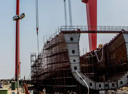 船廠設備安裝工作人員使用倒鏈起吊零部件,快速完成設備安裝工作,提高工作效率。倒鏈是輕小型起重工具,承載量大,提升速度快,工作效率高。